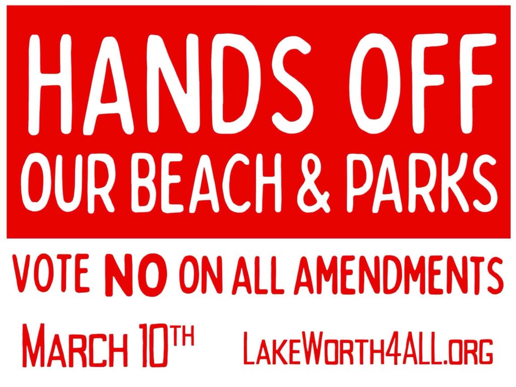 We are a small group of dedicated volunteers with a big job ahead of us – to help Lake Worth Beach voters understand the proposed amendments and their impact on future development in our city AND get them to the polls on March 10th to VOTE NO ON ALL AMENDMENTS. We need yard signs, literature, stickers and more and to get these materials in front of voters ASAP. We would be grateful for your donation, no matter how small. Thank you!